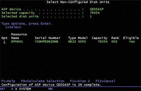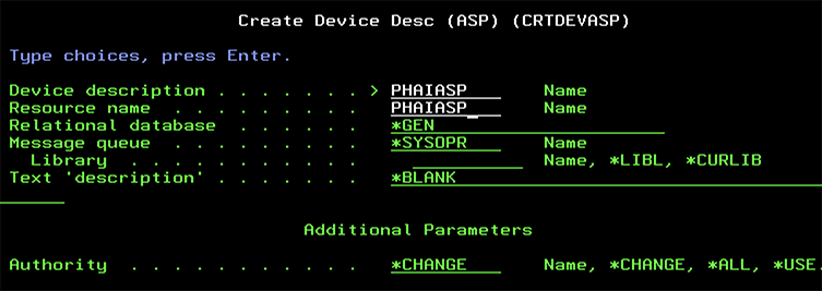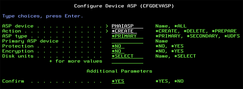 CFGDEVASP ASPDEV(PHAIASP) ACTION(\*CREATE) TYPE(\*PRIMARY) PROTECT(\*NO) ENCRYPT(\*NO) UNITS(\*SELECT)