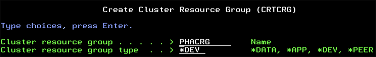**CRTCRG CLUSTER(CLUSTER1) CRG(PHACRG) CRGTYPE(\*DEV) EXITPGM(\*NONE) USRPRF(\*NONE) RCYDMN((PRIMARY \*PRIMARY \*LAST PRIMARY (10.0.0.1))(BACKUP \*BACKUP 1 BACKUP (10.0.0.2)) CFGOBJ((GEOIASP))**