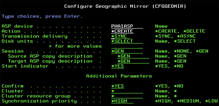 CFGGEOMIR ASPDEV(PHAIASP) ACTION(\*CREATE) SRCSITE(\*) TGTSITE(\*) SSN(BACKUP/PRIMARY/PHASSN) DELIVERY(\*SYNC) UNIT (\*SELECT) CLUSTER(\*) CRG(\*) MODE(\*SYNC) PRIORITY(\*HIGH)