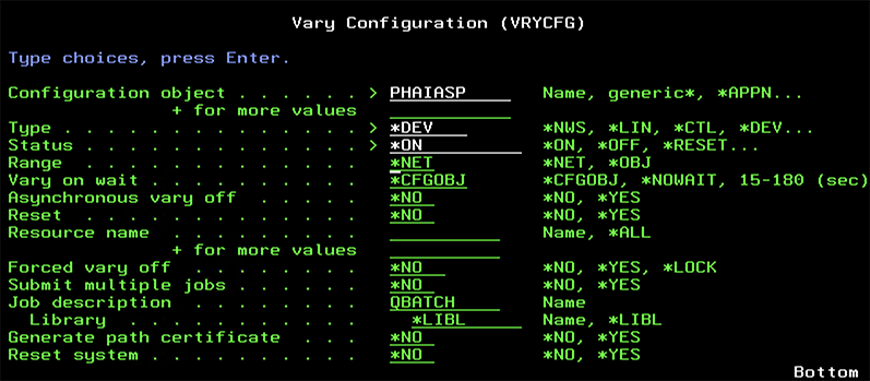 VRYCFG CFGOBJ(PHAIASP) CFGTYPE(\*DEV) STATUS(\*ON)