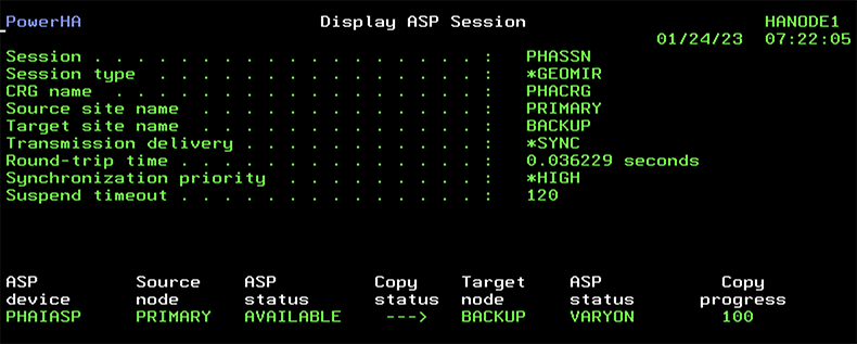 Note: Before you continue, check the previous work. Ensure both nodes are active by using the DSPCLUINF command, or WRKCLU, Opt.6.