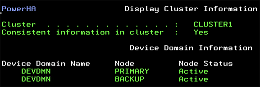 Note: Before you continue, check the previous work. Ensure both nodes show they are part of the device domain, using the DSPCLUINF command, or WRKCLU, Opt 7.